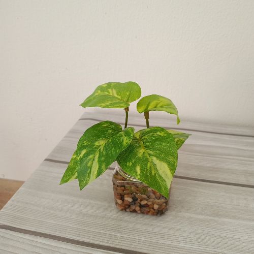 Ela tem folhas verdes brilhantes, muitas vezes com manchinhas claras que dão um efeito muito bonito. Na mesa de centro, a jiboia funciona muito bem em vasos pequenos ou médios, especialmente se os ramos começarem a cair levemente pelas laterais do vaso. Isso cria um efeito natural muito elegante.