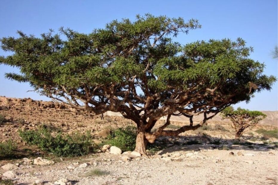 A Commiphora myrrha é uma pequena árvore ou arbusto espinhoso, que geralmente não passa dos 5 metros de altura. Ela tem uma casca prateada ou acinzentada, poucas folhas (pequenas e com três folíolos) e flores discretas, de cor branca ou esverdeada. Mas o verdadeiro tesouro dela não está na sua aparência, e sim no que ela produz 👀